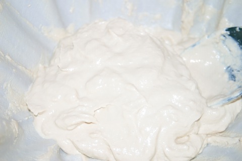 Nun mit den Rührbesen der Küchenmaschine in die Kakao-Mischung einrühren und so lange weiter rühren, bis die Masse cremig wird.