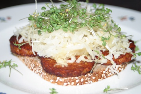 Foto: VK-Brot mit in Sojasoße gebratenem Tempeh, Sauerkraut und Kresse.
