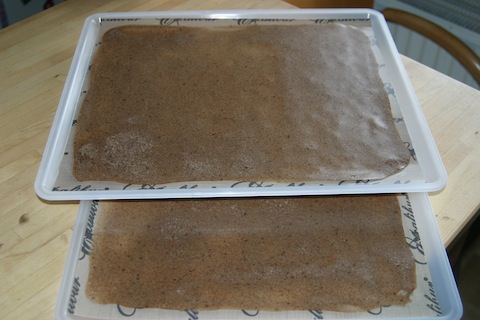 Alles miteinander pürieren und auf zwei Folien (gibt’s extra für die Dehydratoren, sind leider auch sauteuer!) gleichmäßig aussreichen.