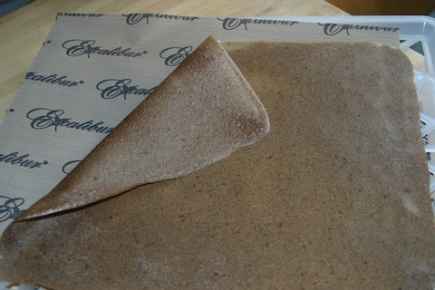 Frucht- Leder eignen sich für eine Art gefüllte Pfannkuchen. Man kann sie mit Nüssen/ Nussmusen und Früchten füllen. Aber es gibt auch herzhafte Varianten, sog. Gemüse- Leder, bei denen verschiedene Gemüse mit eingeweichten Leinsamen oder anderen Getreiden zu einer Art Fladen püriert und ausgestrichen getrocknet werden. Doch dazu später und an anderer Stelle mehr. Nur noch so viel: Auch wenn der Begriff „Leder“ sich für einen Veganer irgendwie gruselig anhört und dann auch noch im Zusammenhang mit dem Essen, so beschreibt der Begriff doch zumindest das Endergebnis so, dass man sich etwas in der Konsistenz vorstellen kann. Gerade die Bananen- Leder sind leicht dehnbar, gut flexibel und einer Art Leder sehr ähnlich.